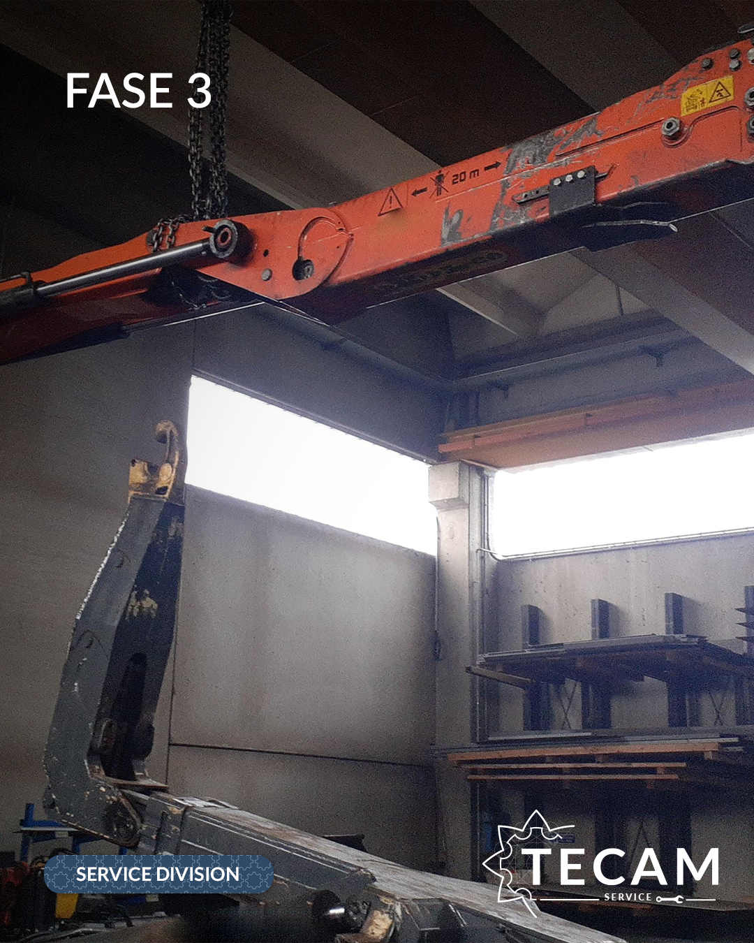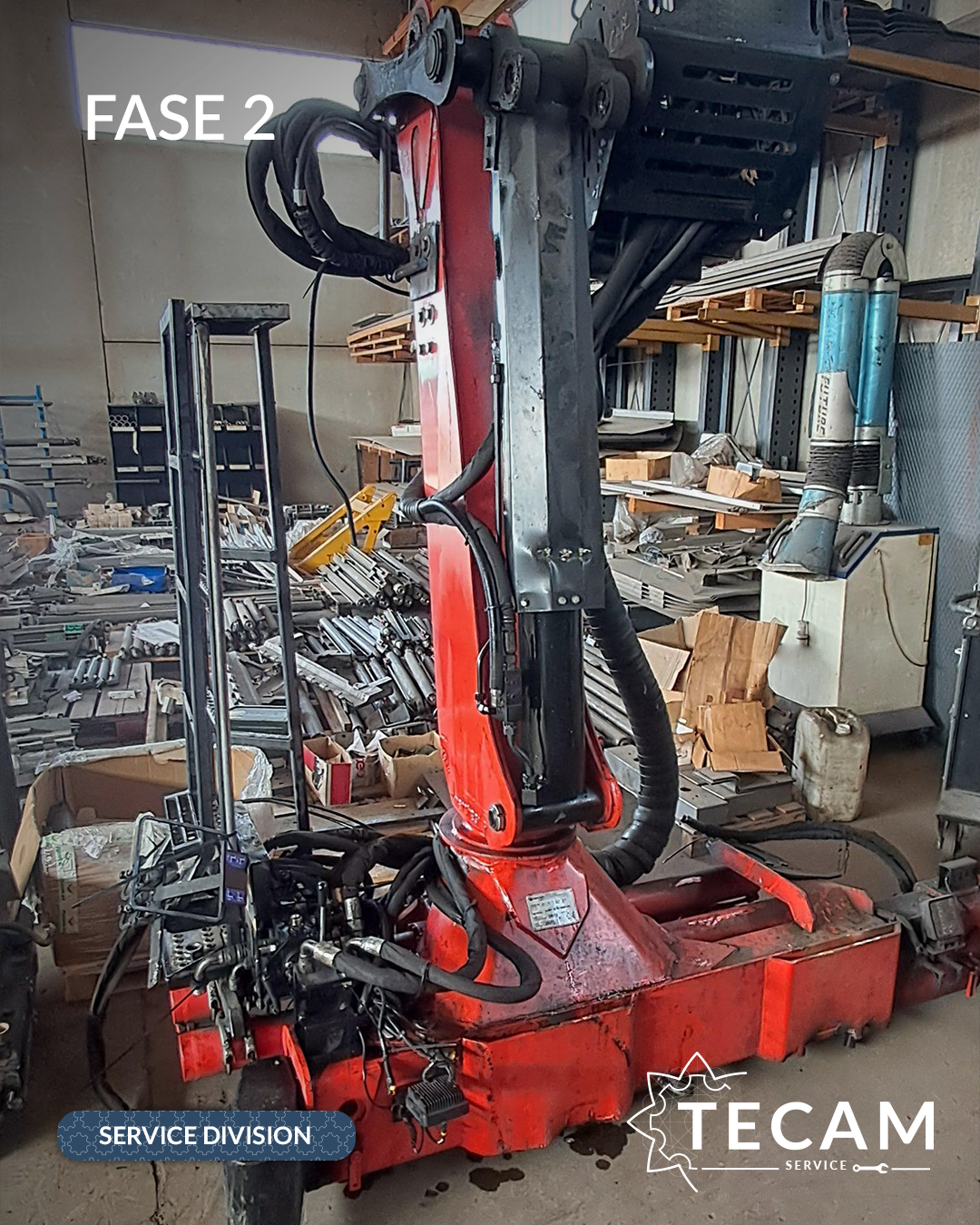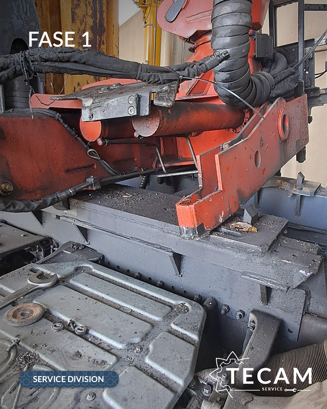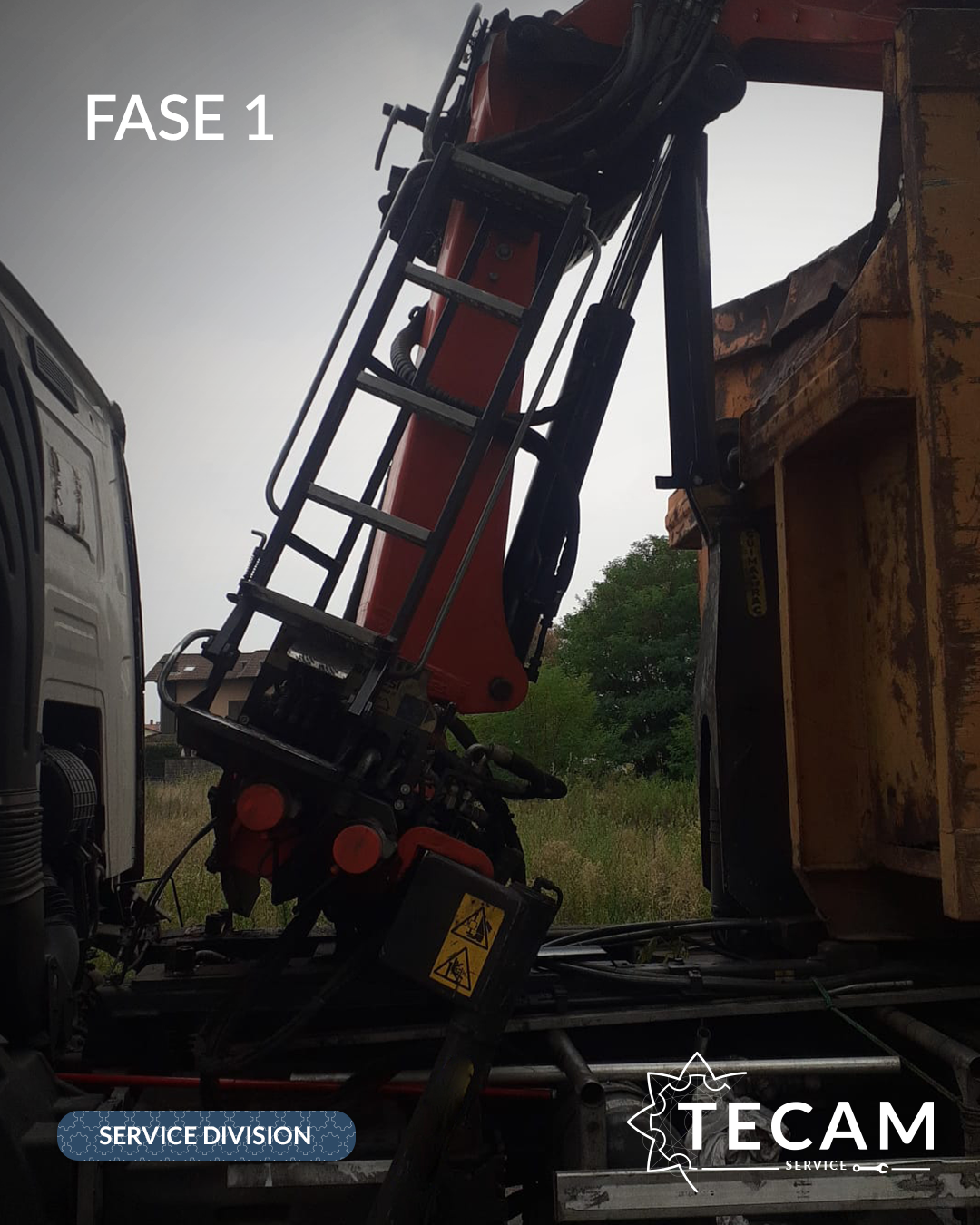 Dopo un’analisi completa da parte del team TECAM, l’intervento è iniziato con lo smontaggio integrale della gru dal telaio scarrabile.