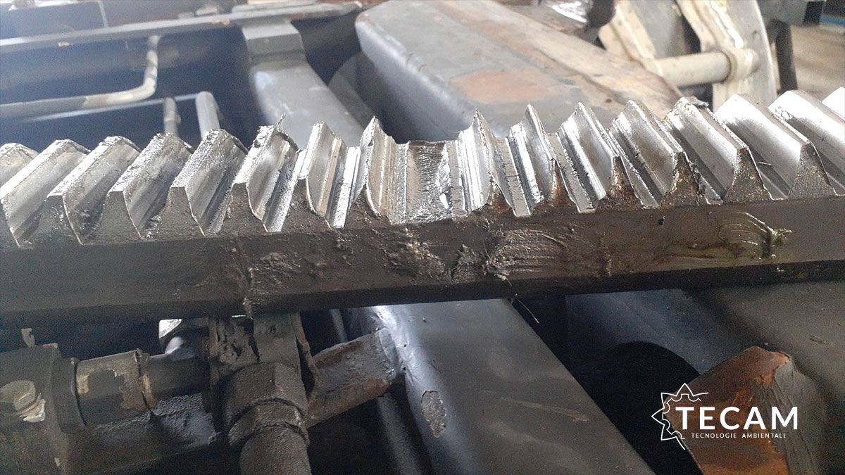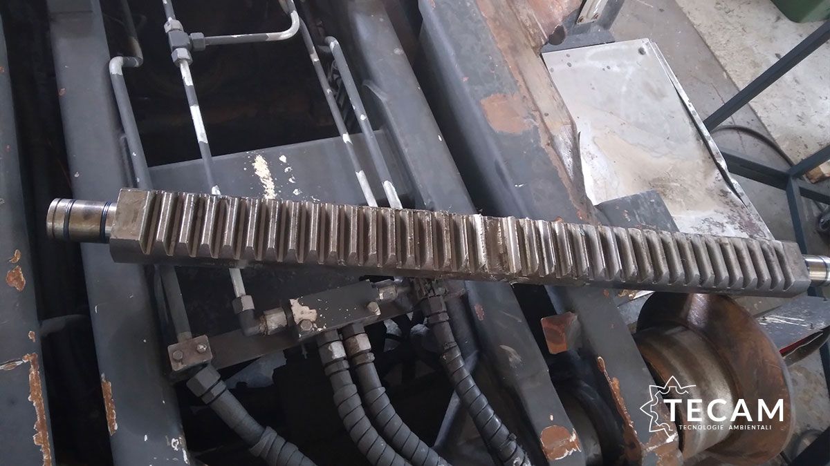 Smontando i cilindri laterali, i tecnici hanno individuato il problema: all'interno del complesso cremagliera/pignone c'era della limatura di ferro, fenomeno che indicava un dente rotto nella cremagliera. Fortunatamente, l'esperienza e la competenza dei tecnici di Tecam hanno evitato che il danno si propagasse ulteriormente, prevenendo così un guasto completo del mezzo.
